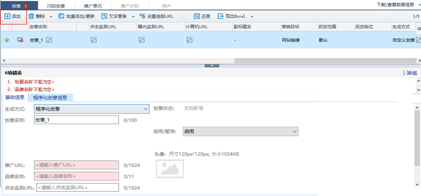 功能入口:打開百度營銷客戶端—信息流推廣—點擊“添加”創意—生成方式選擇“程序化創意”,即可進入“程序化創意”編輯頁面: