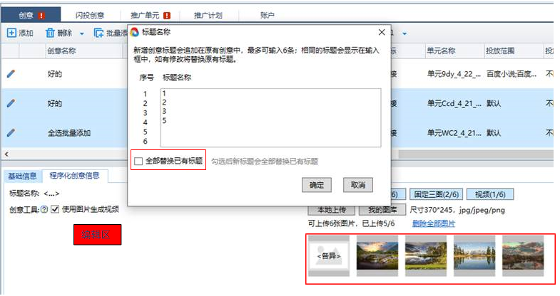 b.“程序化創意信息“批量編輯:點擊標題名稱,彈框顯示多個程序化創意共同的標題,可進行批量編輯,即批量刪除、添加或者全部替換標題。