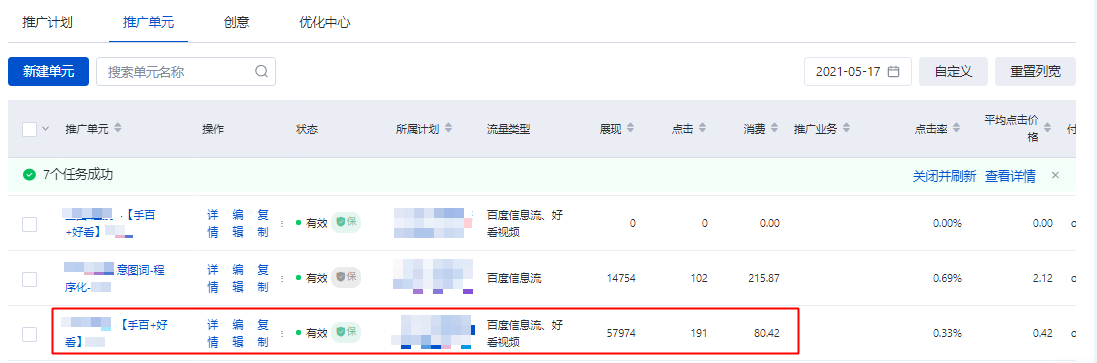 推廣管理頁面以推廣單元維度呈現數據,因此會將單元定向的所有流量數據匯總為一條內容: