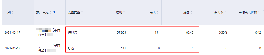 以下圖“手百+好看”單元為例,該單元投放百度信息流和好看視頻兩種流量: