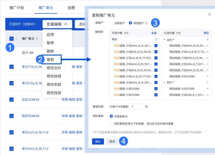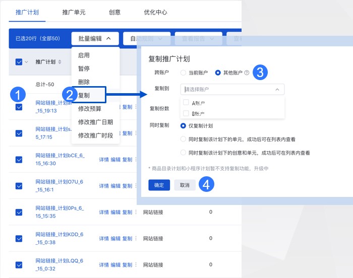 2.2跨賬戶復(fù)制:進(jìn)入推廣賬戶的計(jì)劃/單元列表,使用跨賬戶復(fù)制功能