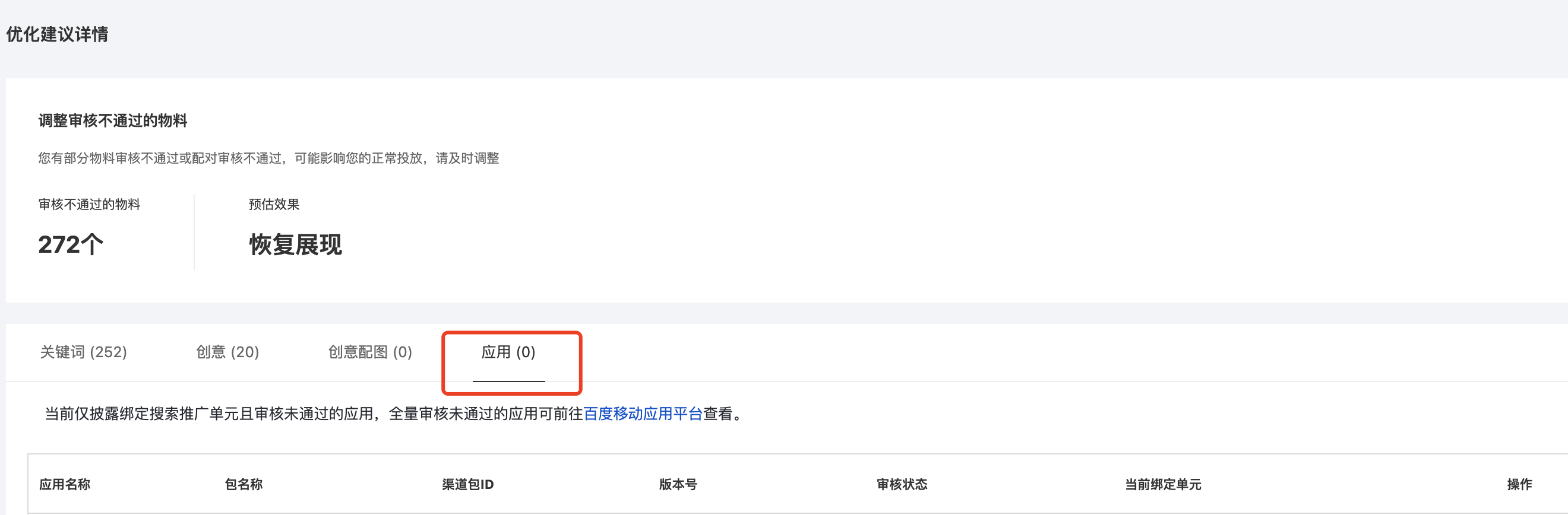 在應用推廣場景下的客戶,可將百度移動應用平臺的應用綁定至搜索推廣單元。但,當某個應用審核不通過時,綁定該應用的單元狀態會變為“應用無效”,導致廣告無法正常投放,影響客戶投放效果。為幫助客戶快速發現審核不通過且已綁定單元的應用,搜索推廣優化中心【調整審核不通過的物料】建議將于2021年9月16日升級,新增披露審核不通過的應用詳情,以及時提醒客戶修改應用從而恢復正常投放。