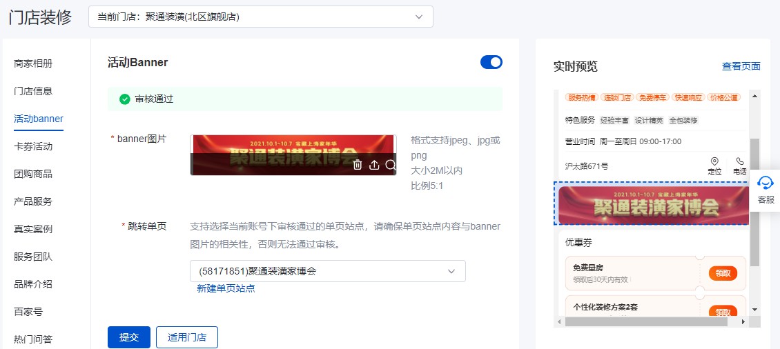 - 設(shè)置路徑:我的門店-門店裝修-活動banner,右側(cè)可實時預(yù)覽banner圖片效果(如下圖)