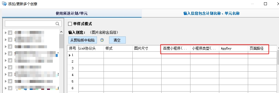 2)、支持excel批量添加,如需投放小程序,請正確填寫“百度小程序”為”投放“否則系統默認為”不投放“;如需投放”小游戲“,在小程序類型正確填寫為”小游戲“,否則系統默認為”小程序“。