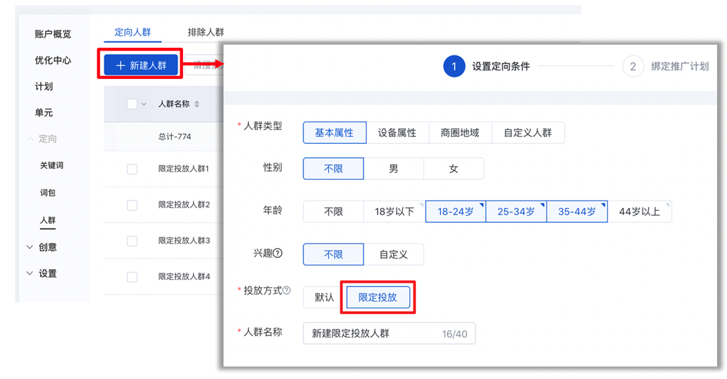 2.1 入口位置:搜索推廣-定向 –人群-定向人群-新建人群-限定投放