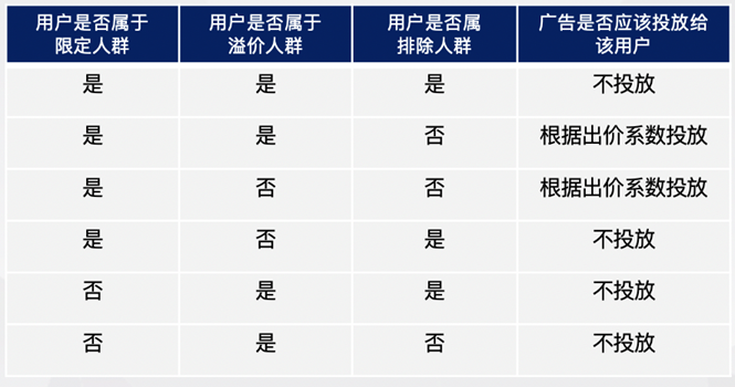 當計劃同時綁定了限定人群,溢價人群和排除人群時,廣告投放規(guī)則如下: