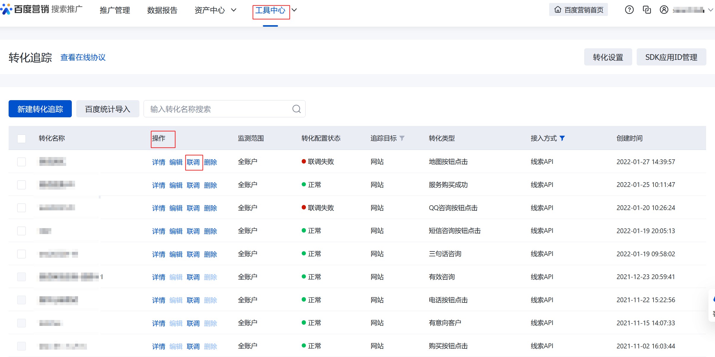 1)搜索:搜索推廣-工具中心-轉(zhuǎn)化追蹤-操作-聯(lián)調(diào);