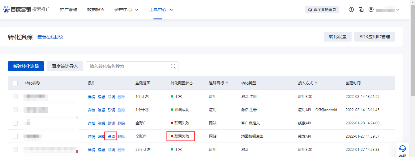 升級(jí)后:新創(chuàng)建的轉(zhuǎn)化追蹤,「轉(zhuǎn)化配置狀態(tài)」默認(rèn)是聯(lián)調(diào)失敗狀態(tài),必須聯(lián)調(diào)成功后(轉(zhuǎn)化配置狀態(tài)是正常狀態(tài))才可進(jìn)行投放,點(diǎn)擊聯(lián)調(diào)后,跳轉(zhuǎn)至商業(yè)開發(fā)者中心(目錄:商業(yè)開發(fā)者中心-開發(fā)輔助-開發(fā)工具-ocpc工具- API工具-線索API聯(lián)調(diào))進(jìn)行聯(lián)調(diào)操作,示例如下: