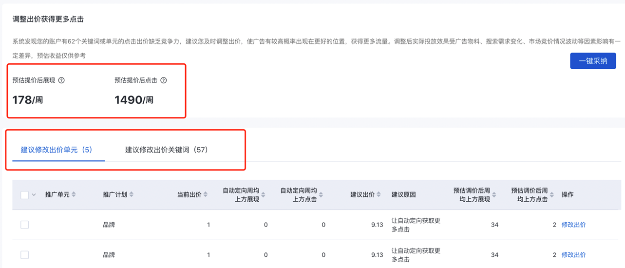 點(diǎn)擊【查看詳情】后,您可以查看系統(tǒng)為每個(gè)單元或關(guān)鍵詞建議的出價(jià),及采納后的預(yù)估效果。
