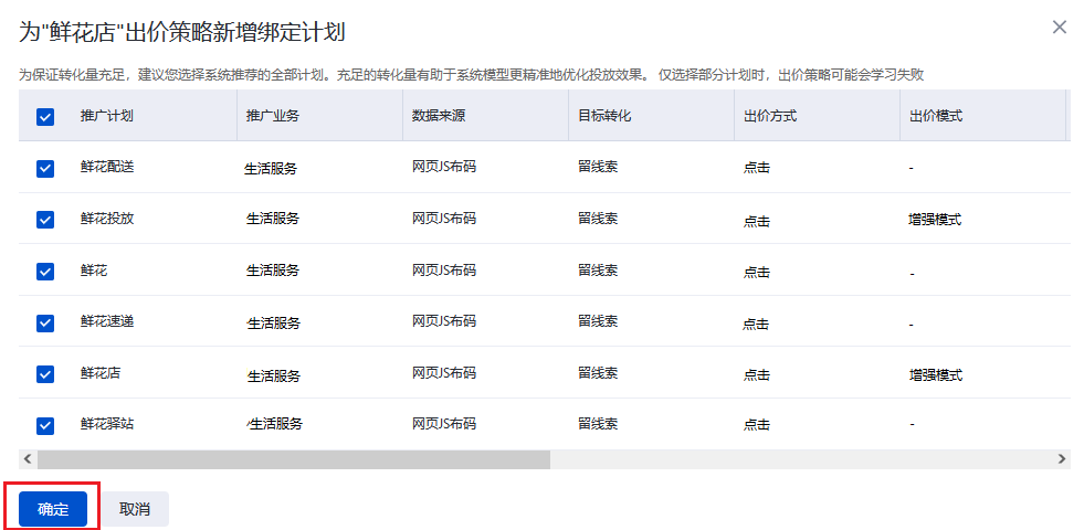 1.對于“已有”類型的出價策略,點擊“確認”采納后,系統會為該出價策略新增綁定已選中的計劃;