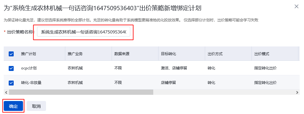 2.對于“新增”類型的出價策略,您可以自定義修改出價策略名稱,方便后續管理出價策略。點擊“確認”采納后,系統將為您新增一個出價策略,同時為該出價策略綁定選中的計劃;