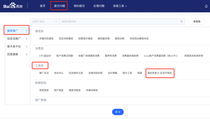 A2:如若發生“買詞不相關”判斷不合理情況,您可以通過風鈴平臺進行反饋。反饋路徑:搜索推廣-工具類-我的競爭力(買詞不相關)。