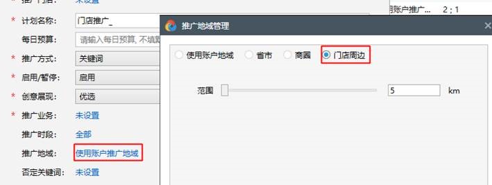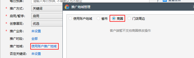 商圈:本期暫不支持編輯,如在web設置商圈定向,在百度營銷客戶端可以看到已選“商圈”選項,但無法查看明細,如下: