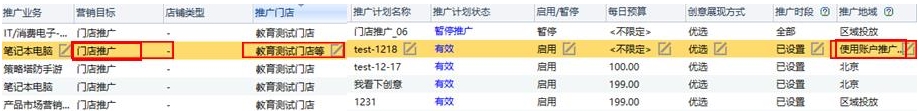 計劃層級-編輯門店計劃:可在列表區和編輯區查看、編輯推廣地域、推廣門店;列表區營銷目標一列可查看、篩選“門店計列表區
