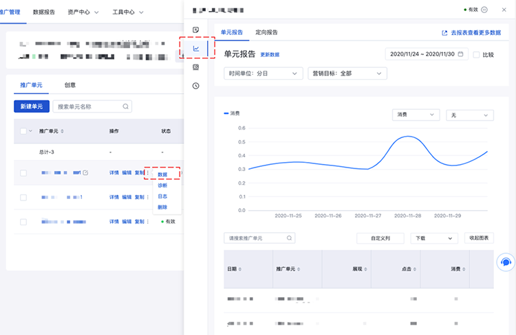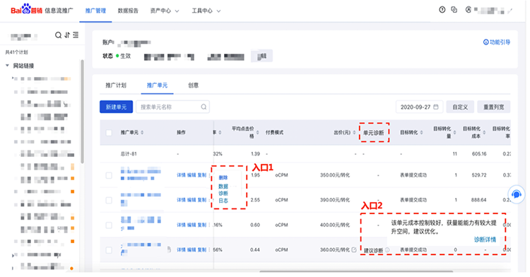 入口1:推廣單元列表-操作列-點擊“:“后調取下拉菜單-點擊“診斷”后調起診斷面板;