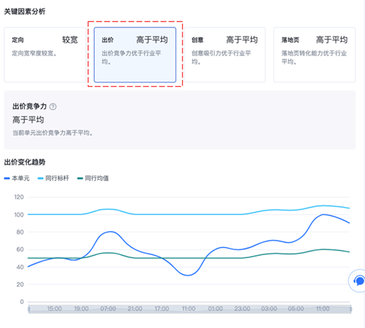 出價競爭力反映在診斷時間區間內的出價水平,出價競爭力排名越靠前,評級越好,越容易勝出