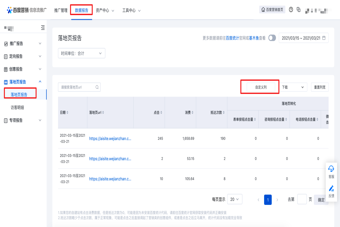 第一步:選擇『數據報告』標簽模塊,選擇『落地頁報告』,選擇『自定義列』