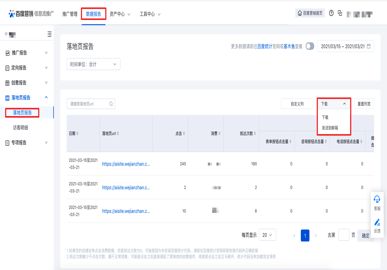 ③入口:信息流推廣平臺 → 數據報告 → 落地頁報告→訪客明細