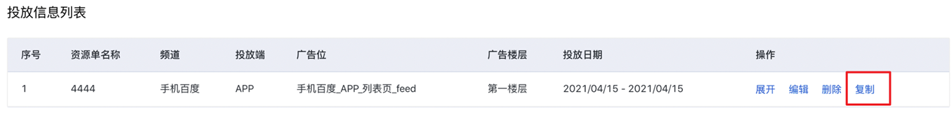 需注意,已經提交詢量的詢量單不能再操作資源單復制,對于品牌impact類的訂單,復制后會清空開屏計劃ID,但保留開屏計劃類型選項。